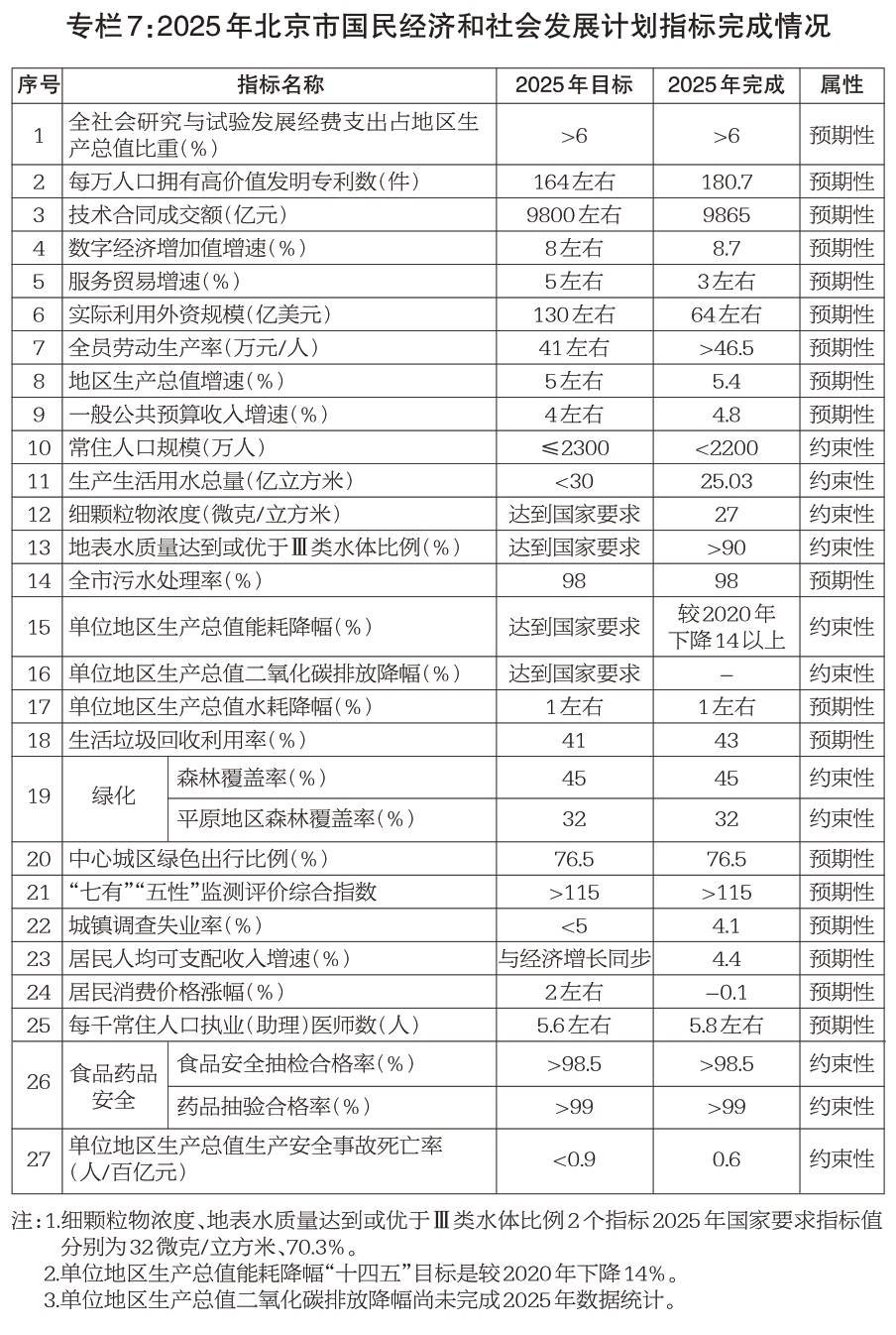 2026-02-072025年,在以习为核心的党中央坚强领导下,在北京市委直接领导下,在市人大及其常委会监督支持下,全市上下坚持以习新时代中国特色社会主义思想为指导,深入贯彻党的二十大和二十届历次全会精神,深入贯彻习对北京重要讲话精神,全面落实市委工作要求,认真执行市十六届人大三次会议审查批准的2025年国民经济和社会发展计划,落实市人大财政经济委员会审查意见,坚持稳中求进、以进促稳,守正创新、先立后破,系统集成、协同配合,圆满完成中国人民抗日战争暨世界反法西斯战争胜利80周年纪念活动服务保障,彰显大国首都形象;经济实现跨越式增长,全市地区生产总值增长5.4%、高于全国0.4个百分点,经济总量突破5万亿元,一般公共预算收入增长4.8%;生态环境建设取得新突破,细颗粒物年均浓度27微克/立方米、首次实现“破30”;民生保障更加有力,城镇调查失业率4.1%,居民人均可支配收入实际增长4.4%,社会大局和谐稳定,“十四五”实现圆满收官。一年来,重点围绕5个方面开展工作。